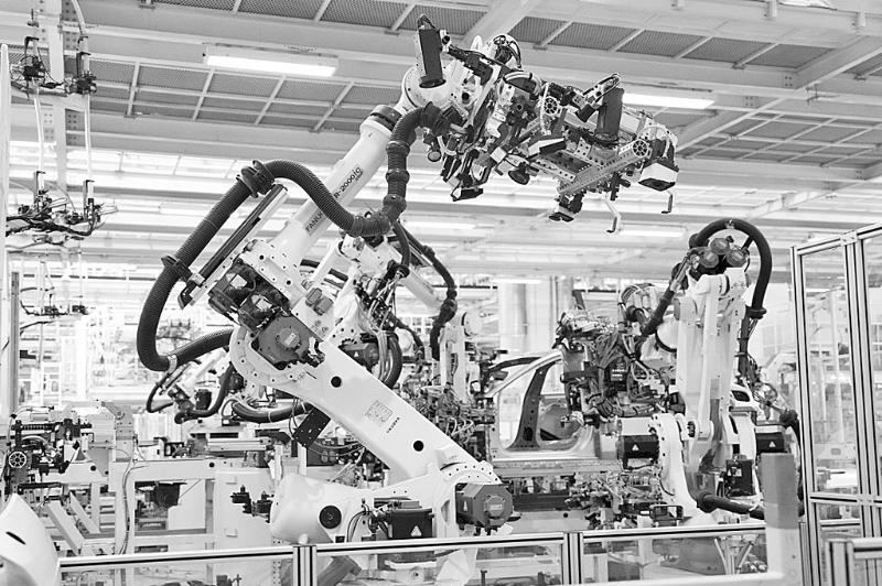 6月16日,机器人在北京小米汽车工厂车间流水线上工作。